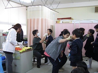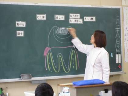 1月28日(火)学校医の外山先生と歯科助手の方々、教育委員会から歯科衛生士の平中先生が来られ、2年生では低学年のはみがき指導、4年生ではフッ化物塗布をしてくださいました。