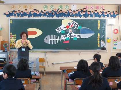 2限目に、栄養士の内田先生に、魚を食べることの良さについて教わりました。