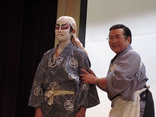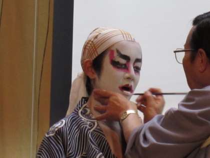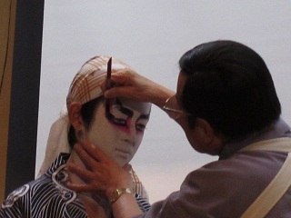 第2部はワークショップ 「獅子の扮装」でした。6年生の男子をモデルとして獅子ができるまで、「化粧(くまどり)から、衣装の着付、かつらをつける過程まで」を見せていただきました。