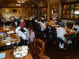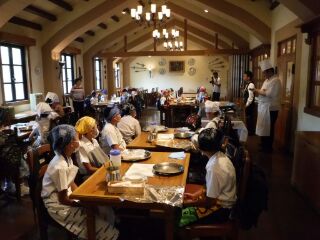 シェフからパエリアの作り方を教わり、グループで協力して作ります。みんな緊張してますよ!