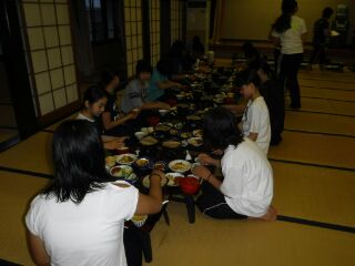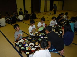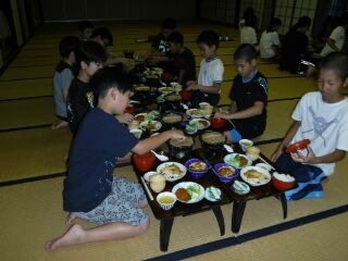メニューは、ハンバーグ、鍋、茶碗蒸し、伊勢うどん等ボリューム満点です。子どもたちは残さず食べようと悪戦苦闘です。私たち大人は、昼食で食べたパエリアが胃にもたれて、食が進みません。