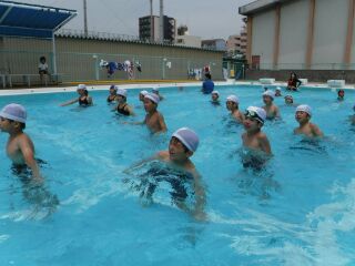 子どもたちが楽しみにしていたプール水泳が1日遅れで始まりました。少し曇っていましたが、子どもたちは元気一杯水泳学習に取り組みました。