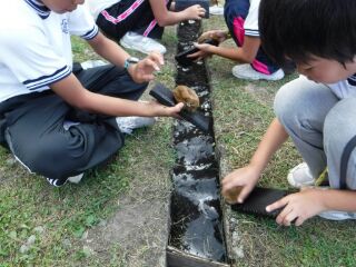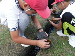 美味しいジュースで少しの間休憩した後は、お土産となる焼き板をたわしや歯ブラシで洗います。