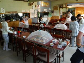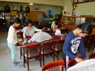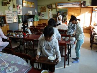 朝食の準備です。慣れない手付きで頑張っています。あれっ?男子の担当はどこだ?