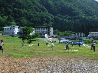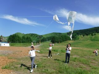 現在凧上げとシャボン玉遊びの真っ最中です。。多くの学校は山登りに向かっていますので、高原は大変空いており、凧上げには最高の場となっています。しかし、残念なことに風が吹いていないため、全力疾走で凧が上がったかと思うと、シュルシュル〜と地面に落ちてしまいます。シャボン玉遊びの方は、大きなシャボン玉、長細いシャボン玉等、面白い形の物が高原を飛び交っています。