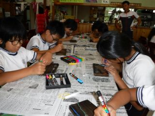カレー作りの片付け途中から雨が降りだし、落雷もありましたので、現在宿舎で焼き板に絵を描く活動を行っています。
