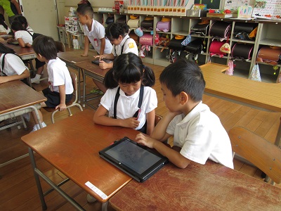 1年生がタブレットを使った学習に取り組んでいました。名前を書いたり、ビンゴゲームをしたりしながら、タブレットの機能に慣れていきます。動物をテーマとしたビンゴゲームの中では、今まで学習してきた英語を取り入れて進めていました。まずはタブレット操作を身につけることも大切ですが、今日の授業のように、学習の手立ての一つとしてタブレットをどのように活用していくかが大切である思います。
