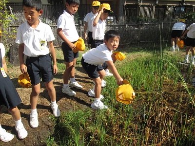 3年生がビオトープを囲んで、池の中や草の合い間を真剣なまなざしでのぞいていました。秋の虫や草花を見つけるたびに声があがり、仲間を集めて観察したり、帽子を伸ばしたりしていました。わずかな時間と場所でしたが、自然に触れ季節を感じていたようです。