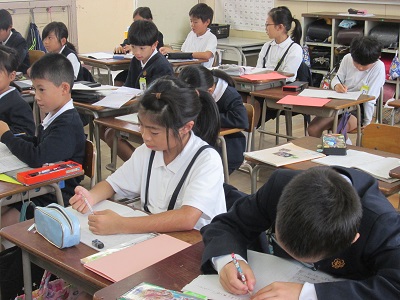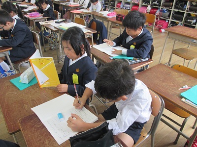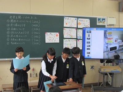 10月初旬に、3年生は社会の学習で関西スーパーに行きました。今日は、見学したまとめを発表する日です。グループで取り組んだ内容をテーマごとに発表していきました。タブレットに撮った「お店の工夫」を、スライドにして大型テレビに写し出しながら、お店や働く人の工夫を発表していきました。写真画面の切り替えも、自分たちでタブレットを操作してタイミングよくできていました。また、発表を聞いている時も、真剣に耳を傾けてノートに気づいたことや思ったことを書きとめていました。タブレットを使って、「資料を活用する力」や「話す・聞く力」を育んでいるようです。