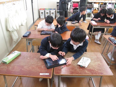 手洗いの学習の続きです。2人で1台のタブレットを使って、話し合いながら学習を進めています。
