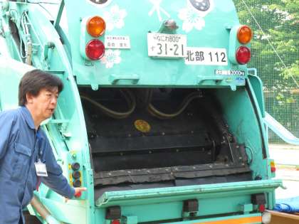 日頃は収集車の内部を見ることはありませんが、投入口をずらすと、広い空間が現れました。「ここにごみが入るんだな」「広いね」との声が出ました。