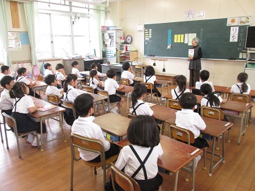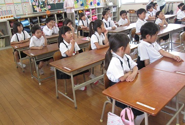 今日の朝は「読書タイム」。1年生と4年生では、ボランティアさんによる絵本の読み聞かせがありました。写真は1年生の様子です。