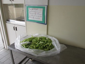 今日の給食は「きびなご天ぷら」「みそ汁」「えんどうまめの卵とじ」でした。給食調理室の出入り口には、写真のような掲示とえんどうの鞘が置いてありました。子どもたちが食材や自然の恵みについて学べるよう、給食調理員が工夫をしています。また、片づけの時間には、みんなが安全で清潔に片付けができるように、環境委員や高学年児童が低学年のフォローをしている様子が見られました。