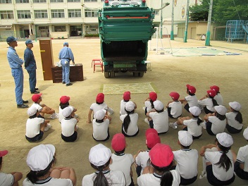 4年生は、社会科の学習で環境問題やゴミ処理のしくみについて学習します。今日は、環境局の方に来ていただいて、パッカー車の役割や仕組みについて学びました。予想以上の音にビックリするシーンもありました。