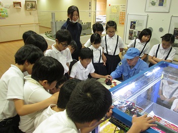 今日は運も良く、見学の時間に大型クレーンが稼働したり、パッカー車が次々にゴミを搬入してきたりと、いろいろなものが動く様子を見ることができました。また代表の児童がクレーンの模型の体験もさせていただきました。子どもたちにとって、とても印象に残る見学になったようです。