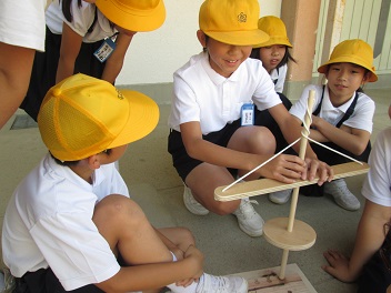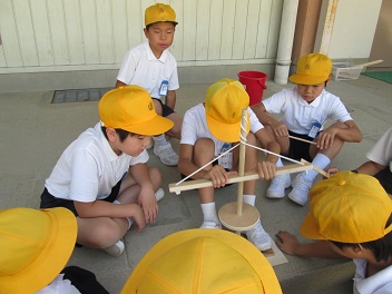 夏の林間学習へ向けて準備を進めている5年生。今日は、管理作業員が手作りした道具を使って火をおこす体験をしました。やってみるとなかなか火が点きません。道具を作った管理作業員のアドバイスを聞きながら何度もチャレンジしているうちに、コツをつかんだ児童が見事に火を点けることに成功しました。昔の人の苦労を知る、火のありがたさを知る、良い体験になったようです。
