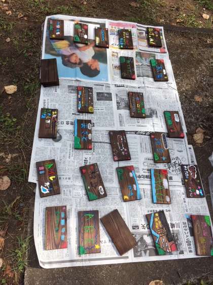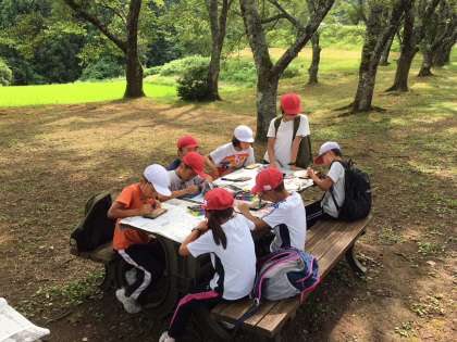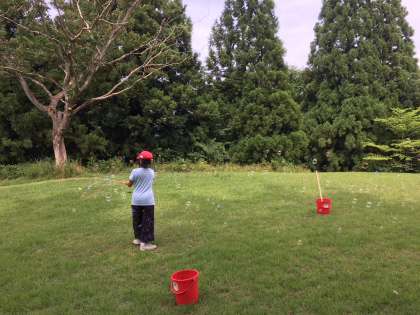 午後のプログラムは焼き板と高原での遊びです。シャボン玉も大自然の中で、とっても気分がいいですね。