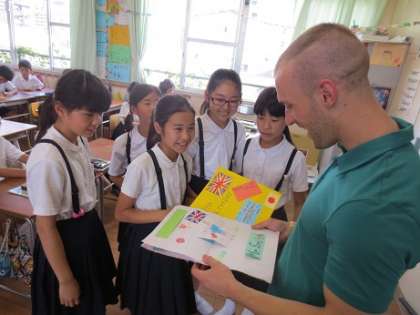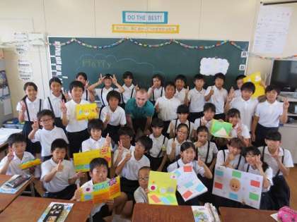 昨日は英語学習でお世話になっているスミス先生のお誕生日をみんなで祝いました。先月の英語学習でスミス先生のお誕生日が「JUNE.28th」と分かったので、子どもたちにみんなでお祝いしないか提案したのです。すると、「お祝いする!カードを作る!」と子どもたちから嬉しい反応がありました。およそ1週間かけ、スミス先生の故郷のイギリスの国旗を飾ったり、スミス先生の顔を画用紙で作ったり、それぞれに手の込んだ作品がしあがりました。そして昨日の英語学習の始めに、「HappyBirthdayToYou」の歌とともにスミス先生を迎え、カードを渡してお祝いしました。カードを渡すときにはグループごとに「HappyBirthDay,Mr.Smith」「いつもありがとうございます。」などメッセージ付きで渡していました。スミス先生も嬉しそうな表情をうかべコメントしてくださっていました。子どもたちとの触れ合いを大切にし、休み時間にはいっしょにドッジボールをしてくれる優しいスミス先生がみんな大好きです。
