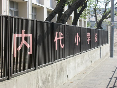 小学校南側の道路沿いに柵に施された「内代小学校」の文字が、明日、応援に来てくださる方々をお迎えいたします。9月に入って雨が続いたために完成が延び延びになっていましたが、管理作業員が雨の合間を縫って仕上げたものです。通行のひと時の楽しみに是非ともご覧ください。