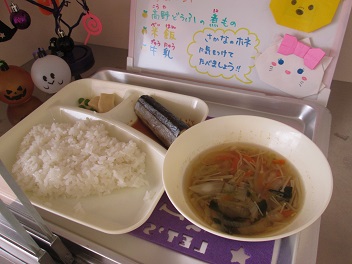 給食には、食育の意味もこめて旬の食材が使われることが多いです。今日は、秋の味覚サンマが登場しました。小骨が多くて食べにくいと感じた子もいたのではないかと思いますが、食材の特徴を知り、食べ方を学ぶのも大切な経験です。