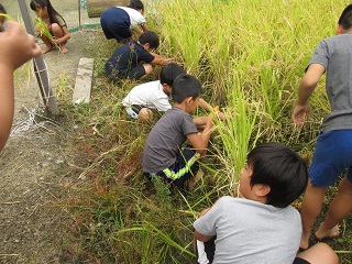 5年生が、春に田植えをした田んぼで稲刈りをしていました。初めての体験ですが、お互いに協力し自然の恵みを感じながら取り組んでいました。うまく脱穀までできたら自分たちで炊飯して試食する予定です。