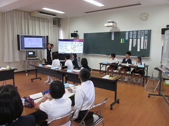 4・5・6年の代表委員の話し合いの様子です。「内代小のみんなが楽しい学校生活を送ることができるように」という議題で、学校行事や児童集会でどんな事に取り組んでいくか話し合っていました。これまでにもご紹介してきたように、本校では、教科の学習でデジタル教科書やタブレットなどのICT機器を活用していますが、この代表委員会でも、自分たちの考えを発表する時に書画カメラを活用し、話し合いたい内容をみんなで共有して意見交流できるようにしています。活動を通して、聞く力、話す力、考える力などが育っていくと考えています。さらには、学級という同年齢の仲間との話し合いとは一味違って、異学年の仲間との話し合いという環境も新たな学びの機会となっているのではないでしょうか。