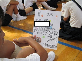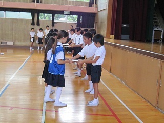 今日は、縦割り班で1学期間活動して、合計得点の高かった班の表彰式でした。活動委員会の子どもたちの手作り表彰状が手渡されました。