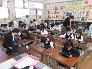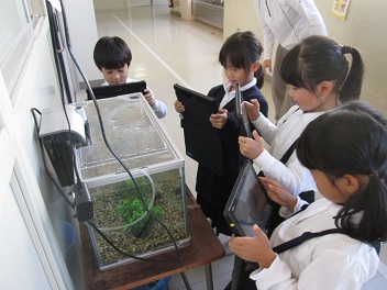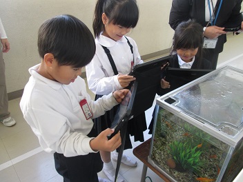 昨年、「学校情報化優良校」の認定を受けた本校。学習や活動の場面でタブレット端末を活用する機会を設けています。有効な活用のためには、1年生から少しずつ慣れていくことが大事です。今日は1年生が生活科の中で、金魚の観察をおこない、写真と動画の機能を使って観察記録をとりました。操作に不慣れな1年生ですが、ICT支援員さんが来校されて丁寧に教えてくださりました。
