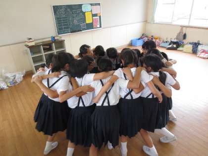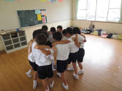 広くなった教室で円陣を組み、明日からの林間学習に向けて気合もアップ!