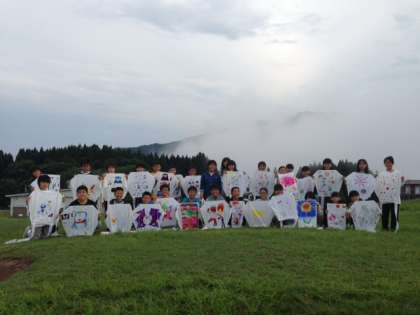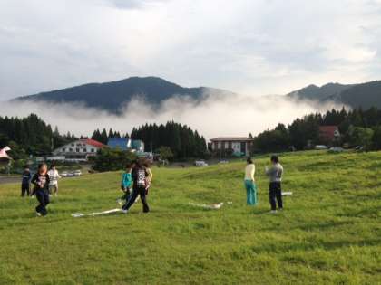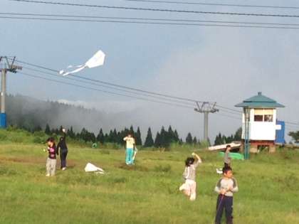 雨があがったので、学校で作ってきた凧を高原で揚げました。高原を元気に走り、がんばっていましたが、ちょっと風が弱く高く上がったとはいえませんでした。でも、おいしい空気の中でしっかり走り回った子どもたちの顔は満足そうでした。