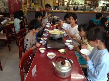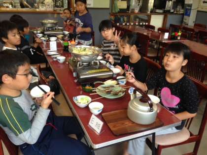 1日目の晩御飯は豚味噌鍋でした。窓を開け、部屋にはさわやかな風が入ってきているので、熱い鍋料理でもとてもおいしくいただけました。ご飯をどんどんおかわりする子が多く、どの班の鍋も空っぽになりました。ごちそうさまをし、間もなくキャンプファイヤーに出発します。