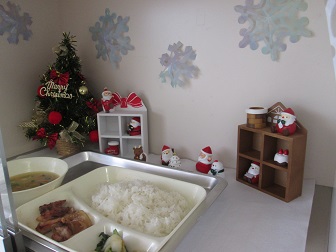 子どもたちが給食室のサンプルケースの中を興味津々といった感じで見ていました。何があるのかと覗いてみると…。給食調理員の工夫で、その時々で季節の雰囲気を楽しめるようになっている給食室。何気ない所で、ふと季節感を感じることができるのは大切なことですね。