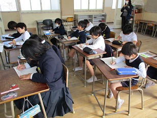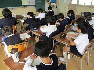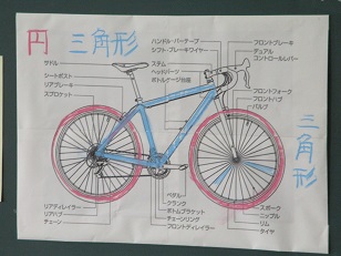 3年生の算数の様子です。まずは自転車の絵の中にかくれている図形をさがし、子どもたち自身で今日の学習の内容に気づいていきます。その後、どのようにしたら円の中に三角形を描くことができるかを考えていました。