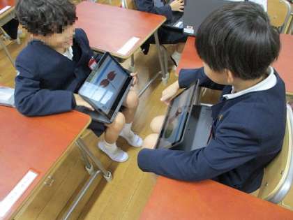 国語では「なにに見えるかな」の学習をしています。タブレットを使って、どこの部分が何に見えるかを友だち同士で説明しています。算数では、くり上がりのたし算に入りました。最初はブロックを使っていましたが、今ではさくらんぼ計算ができるようになっています。