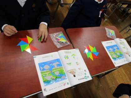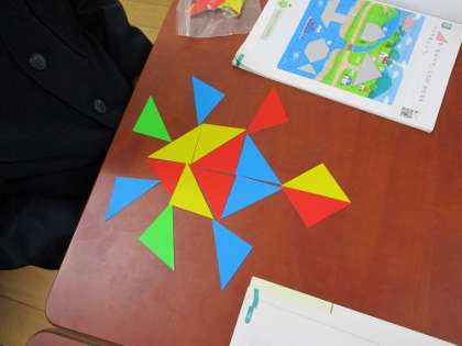 くり上がりのたし算が終わり、「かたちづくり」の学習に入っています。三角の色板を使って、教科書に載っているおうちや船、かざぐるまなどを作りました。その後は自分で好きな模様や形を作りました。イナズマ、カブトムシ、へび、ロケット、ロボットなど工夫して作っていました。