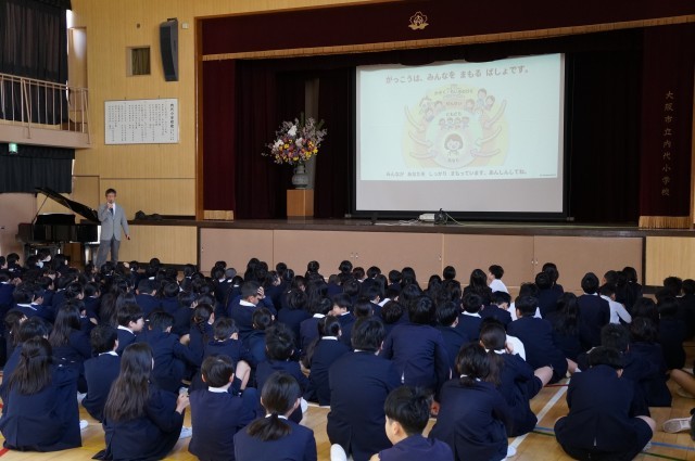 写真は始業式での校長先生からのお話の様子です。
