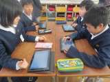 動画を観た後、班で話し合っている様子です。タブレット端末を活用して、実際のメー...
