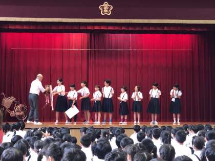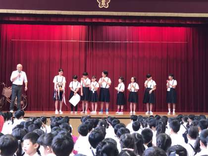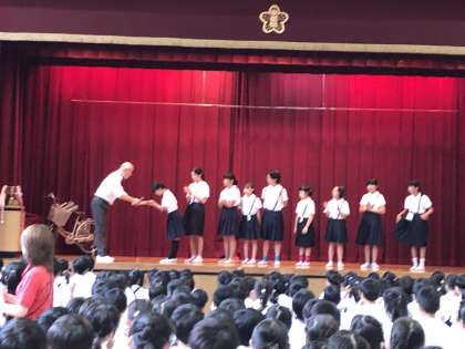今朝は児童朝会で、表彰とお友だちの紹介がありました。