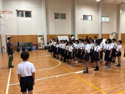 宿舎のサンダイフクに到着しました。開舎式です。こどもたちは、朝の出発式のようにピリッとした表情で挨拶ができました。雨がまだ降っていますが、予定通り魚つかみが、できそうです。