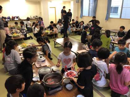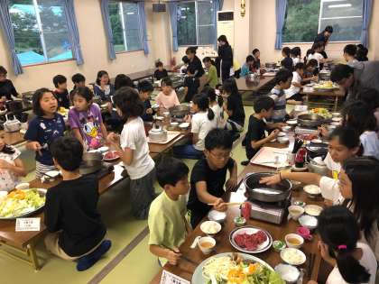 魚つかみに大歓声!まずは、水の冷たさにびっくり。初めて魚をつかんだ人もたくさんいましたが、苦手な人も友だちの協力を得てつかまえることができました。とれた魚は、「おいしかった!」楽しかった魚つかみに時間がかかったので予定変更をして、お風呂の前に夕食です。すき焼きです!最高!やったぁ!