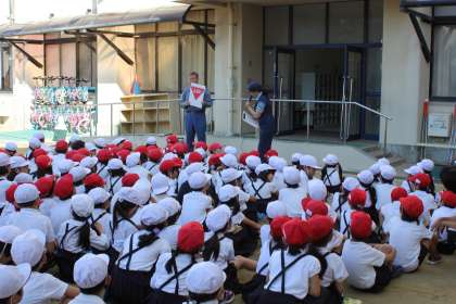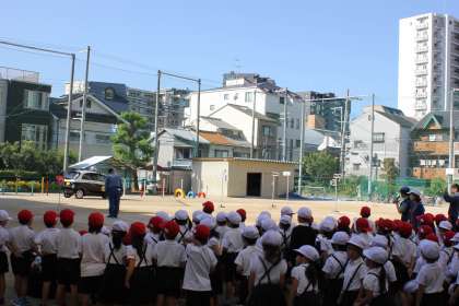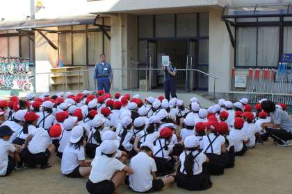 1時間目には1年生と2年生が歩道の正しい歩き方についてお話を聞いた後、事前に校庭に線を引いて作っていただいた模擬道路を、実際に歩きました☆