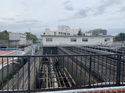 何と今回、沈殿(でん)池が2年に1回のメンテナンス中ということで、池の水ぜんぶ抜かれていました。普段はまず見ることのできない、沈殿池の内部を見学することができました。
