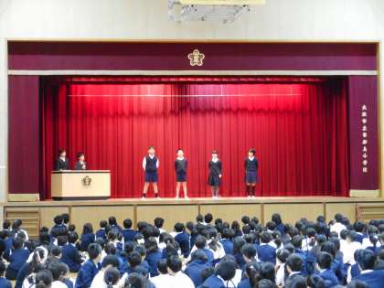 ステージに上がった集会委員がある言葉を一文字ずつ分けて、
