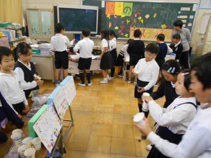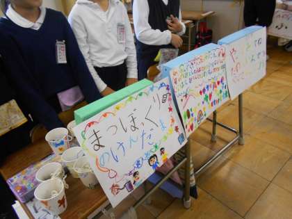 「どんぐり」や「まつぼっくり」が、こま・やじろべえ・マラカス・けん玉などに変身しています。すごい!! 1年生たち、がんばって作りましたね。
