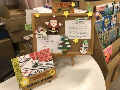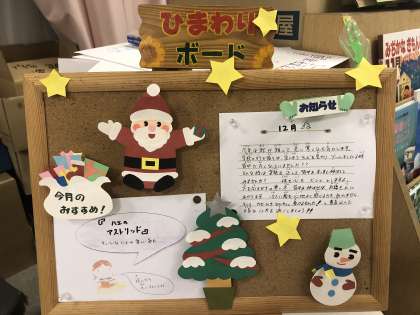 今月のひまわりボードはサンタさんに、もみの木に、雪だるまと