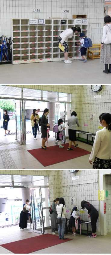 5月16日(日)、新1年生の入学にかかるオリエンテーションをおこないました。登校を3分割にしての実施となりました。まず、玄関で検温確認や手の消毒のあと、傘たてや上ぐつの場所を確認してもらいました。
