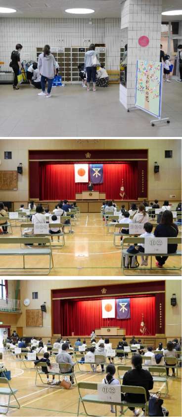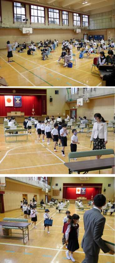 オリエンテーションでは校長先生のお話のあと、先生がたの紹介、登校の説明がありました。新1年生は、担任の先生につれられて、それぞれの教室で学級活動をしました。
