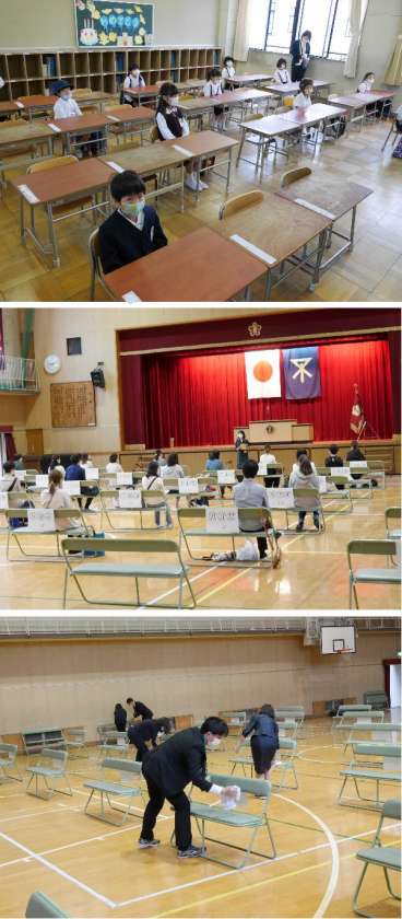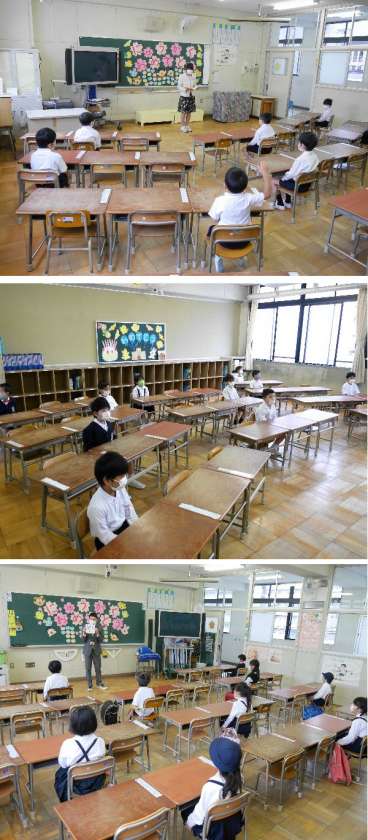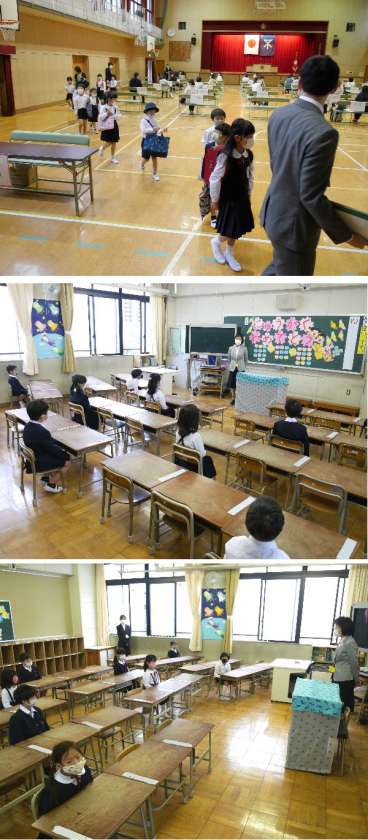 新1年生の児童たちは、それぞれの教室の自分の席に座って、担任の先生から名前を呼ばれてお返事をしました。3分割でオリエンテーションをおこなうため、終了後に座席の消毒を行いました。