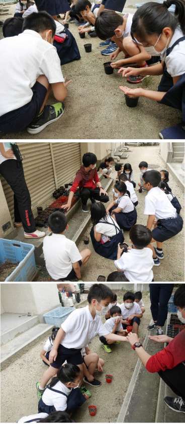 3年生の登校日です。ホウセンカとマリーゴールドの種をポットに植えました。