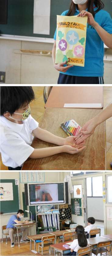 1年生の登校日の様子です。2年生が1年生の時に育てたアサガオの種がプレゼントされました。もらったアサガオの種をもらって、観察して絵にしました。